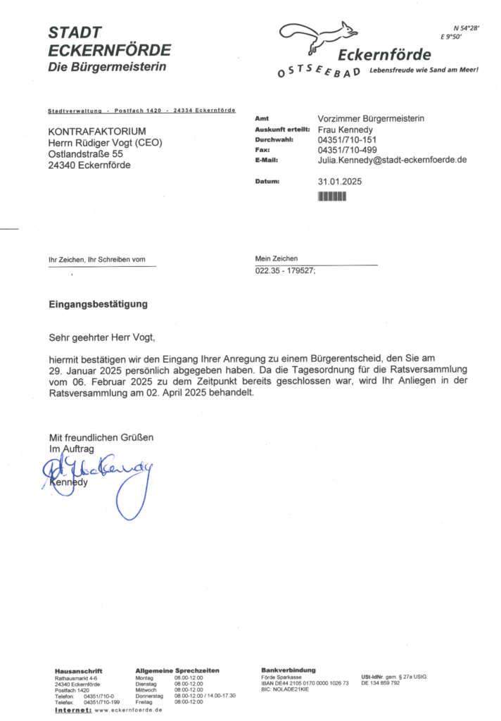 Zwischenzeitlich ist bei der Stadt Eckernförde ein Antrag zur Festsetzung eines Bürgerentscheides eingereicht worden.