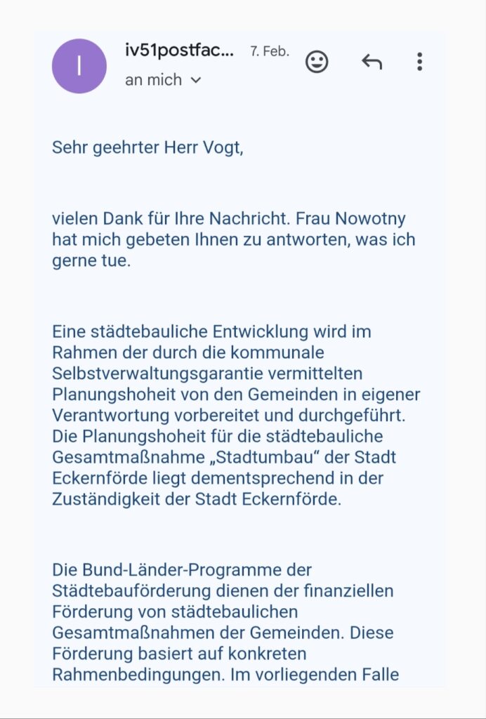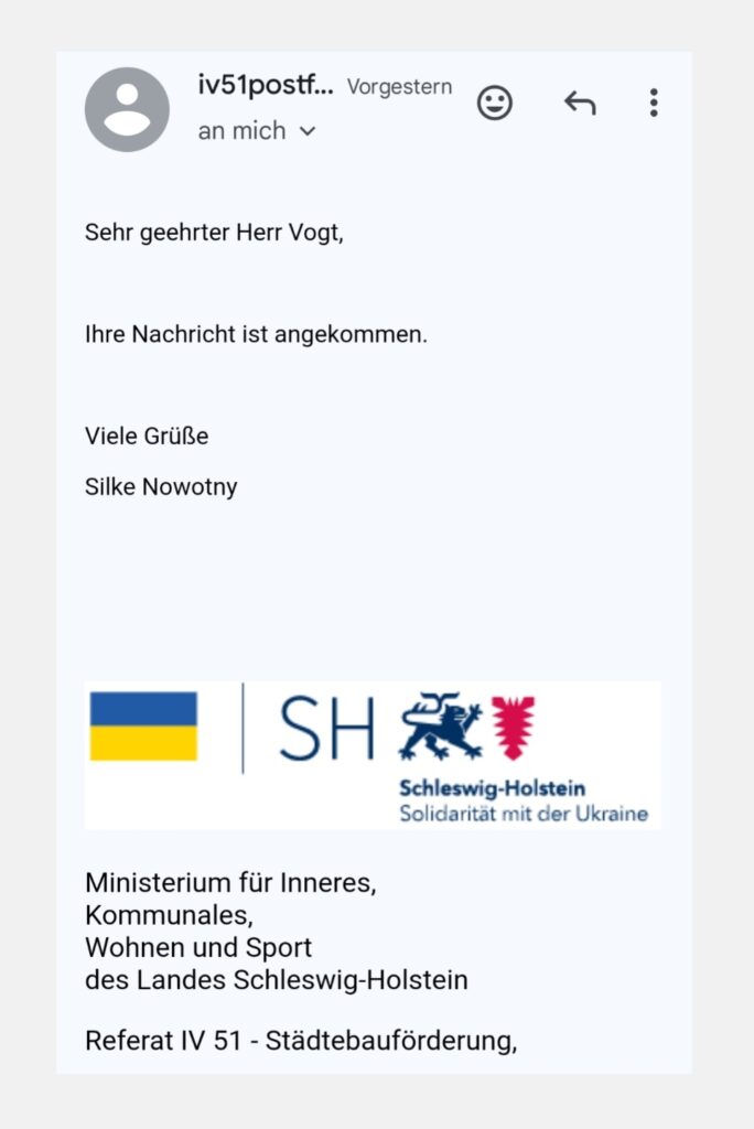 Das Antwortschreiben des Referates IV 51 mit dem Hauptaugenmerk: Die Planungshoheit liegt ausschließlich bei der Stadt Eckernförde